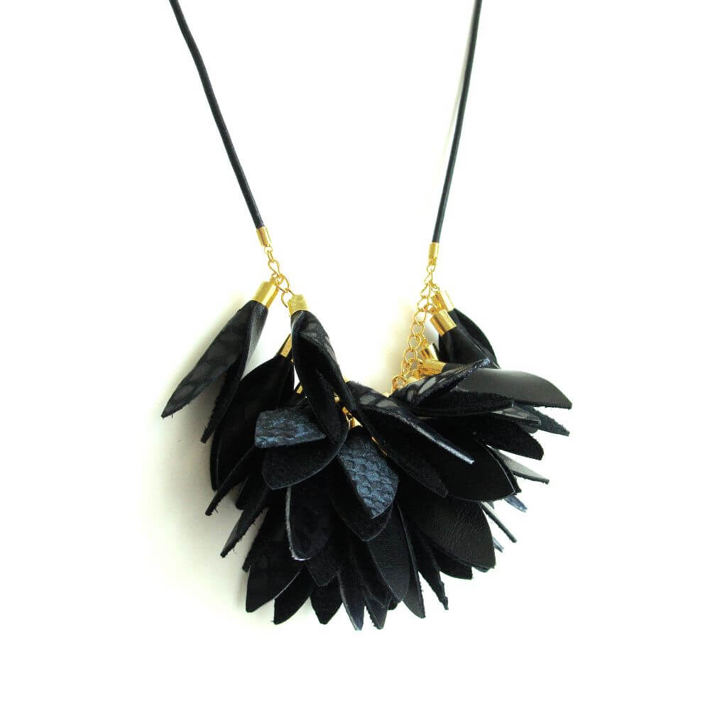 Flügel aus Leder mit unterschiedlichen Oberflächenstrukturen sind an einer Metallkette angebracht, die wiederum hängt an einem schwarzen Lederband.