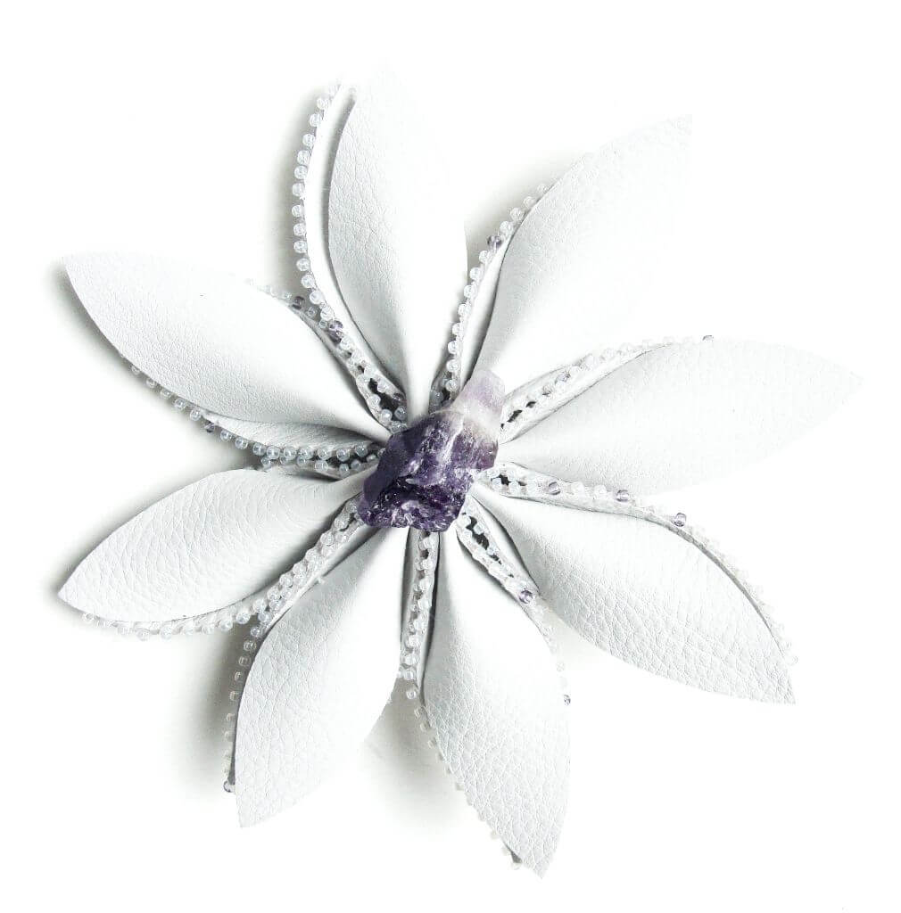 Eine weiße Lederbrosche mit weißen und violetten