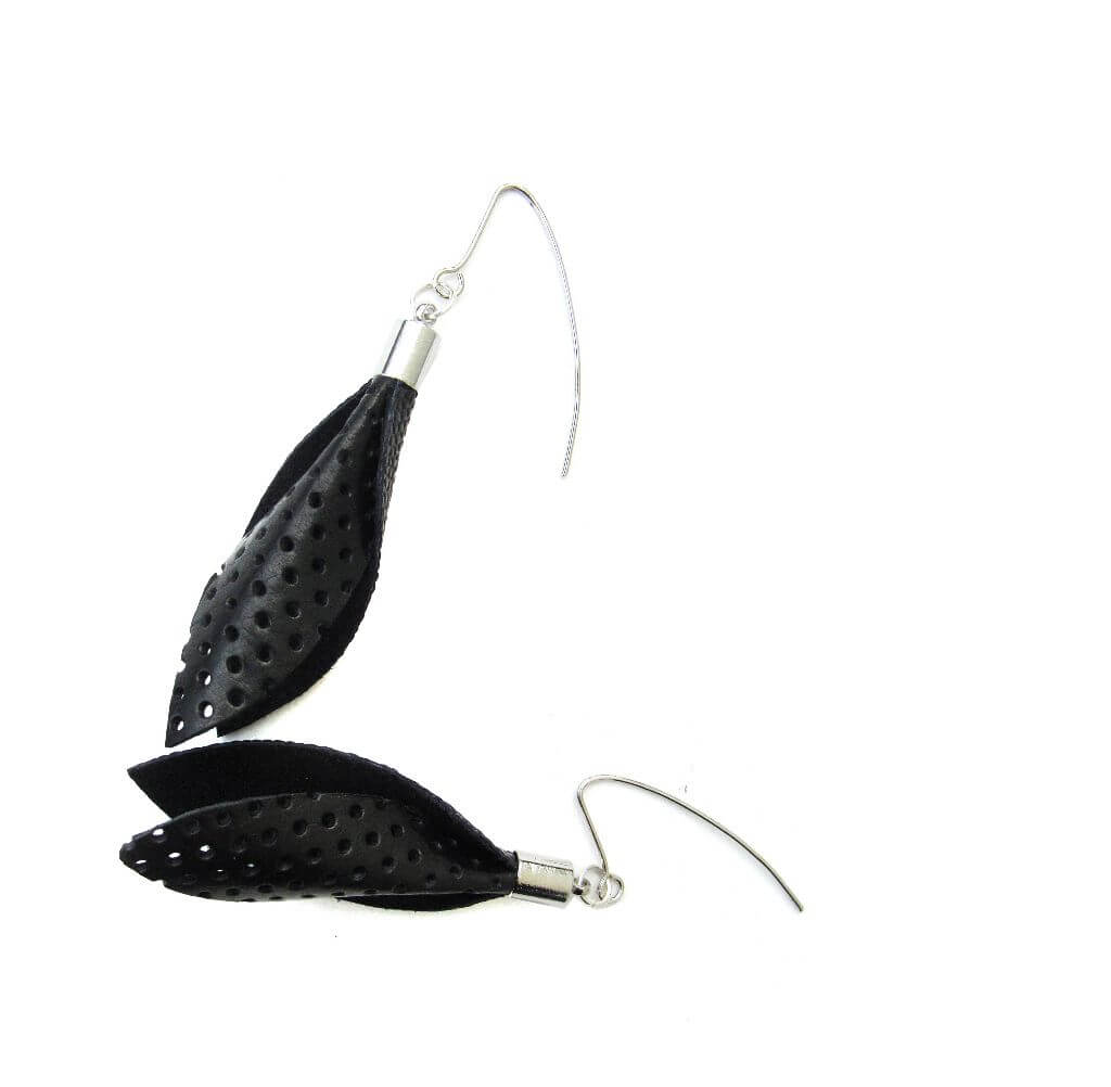 Kolczyki z dwóch rodzajów czarnej skóry naturalnej: z dziurkami i wypustkami. Projekt autorski z pracowni vanBALO.