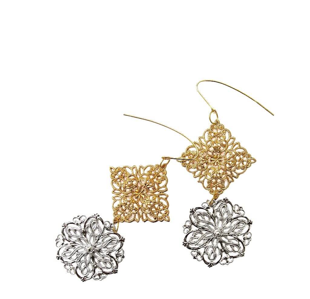 Kolczyki z metalowej koronki o srebrno – złotym kolorze. Delikatne struktury zamknięte w geometryczne formy.